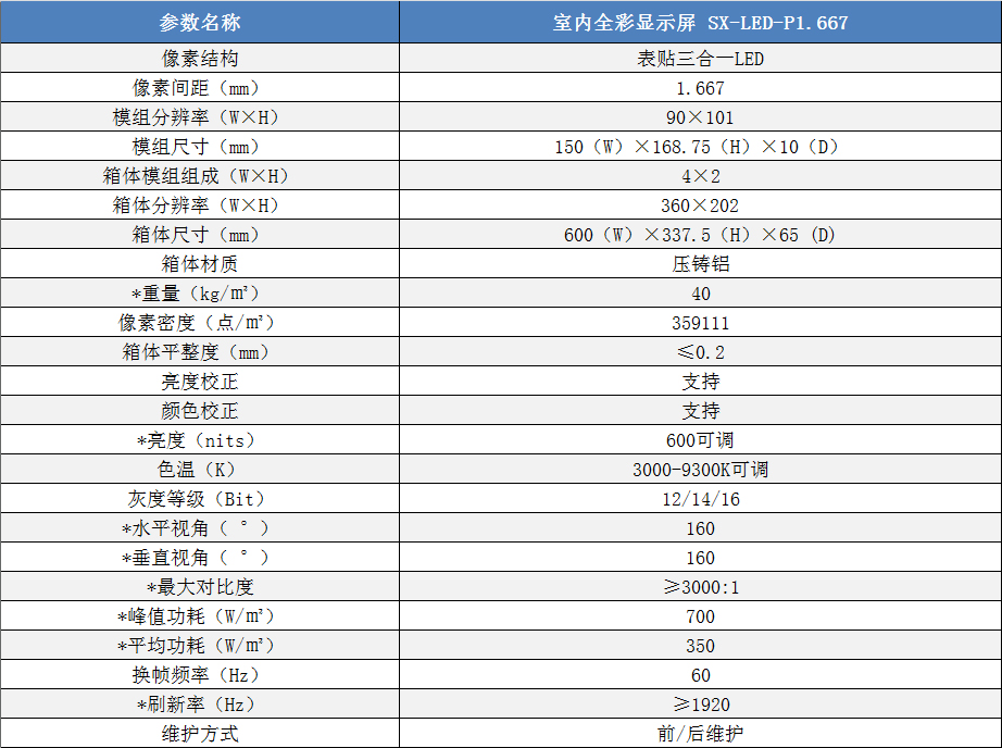 P1.667室內(nèi)小間距高清全彩LED顯示屏技術(shù)參數(shù):