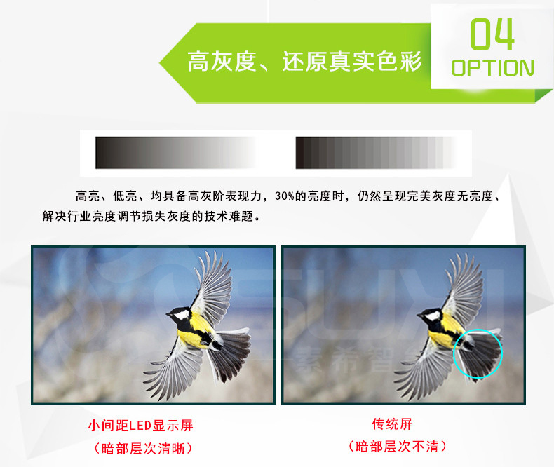 1、P2全彩顯示屏采用四燈合一HD LED封裝技術(集成SMD+COB優點),該技術解決墨色一致性、拼接縫、漏光、維修等問題,同時具備高對比度、高集成、易維護、耐撞擊、防串光等特點。