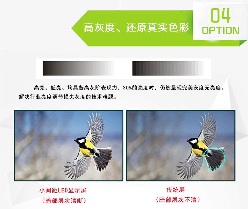 1、P1.562全彩顯示屏采用四燈合一HD LED封裝技術(shù)(集成SMD+COB優(yōu)點(diǎn)),該技術(shù)解決墨色一致性、拼接縫、漏光、維修等問題,同時(shí)具備高對(duì)比度、高集成、易維護(hù)、耐撞擊、防串光等特點(diǎn)。